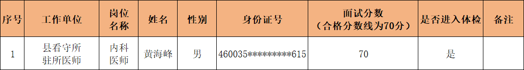 《保亭黎族苗族自治县医疗集团考核招聘派驻保亭县看守所驻所医师公告》招聘工作人员面试已结束,现将面试成绩及入围体检人员名单公示如下: