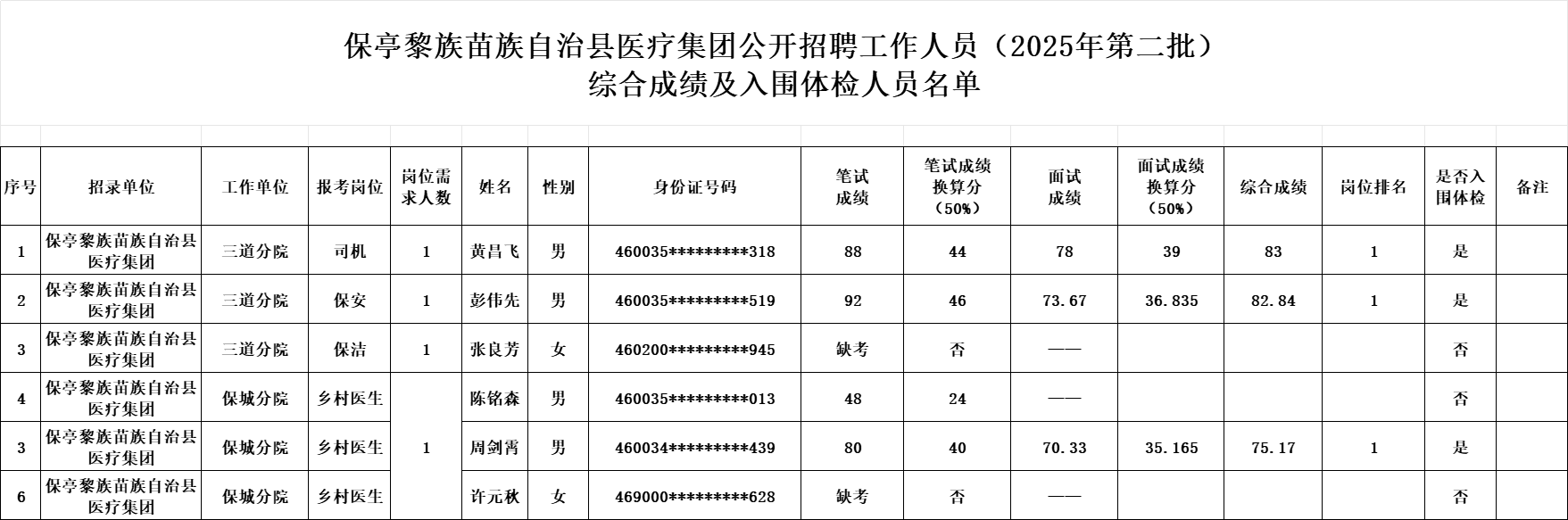 保亭黎族苗族自治县医疗集团2025年公开招聘工作人员(第二批)笔试、面试均已结束,现将考试综合成绩及入围体检人员名单公示如下:
